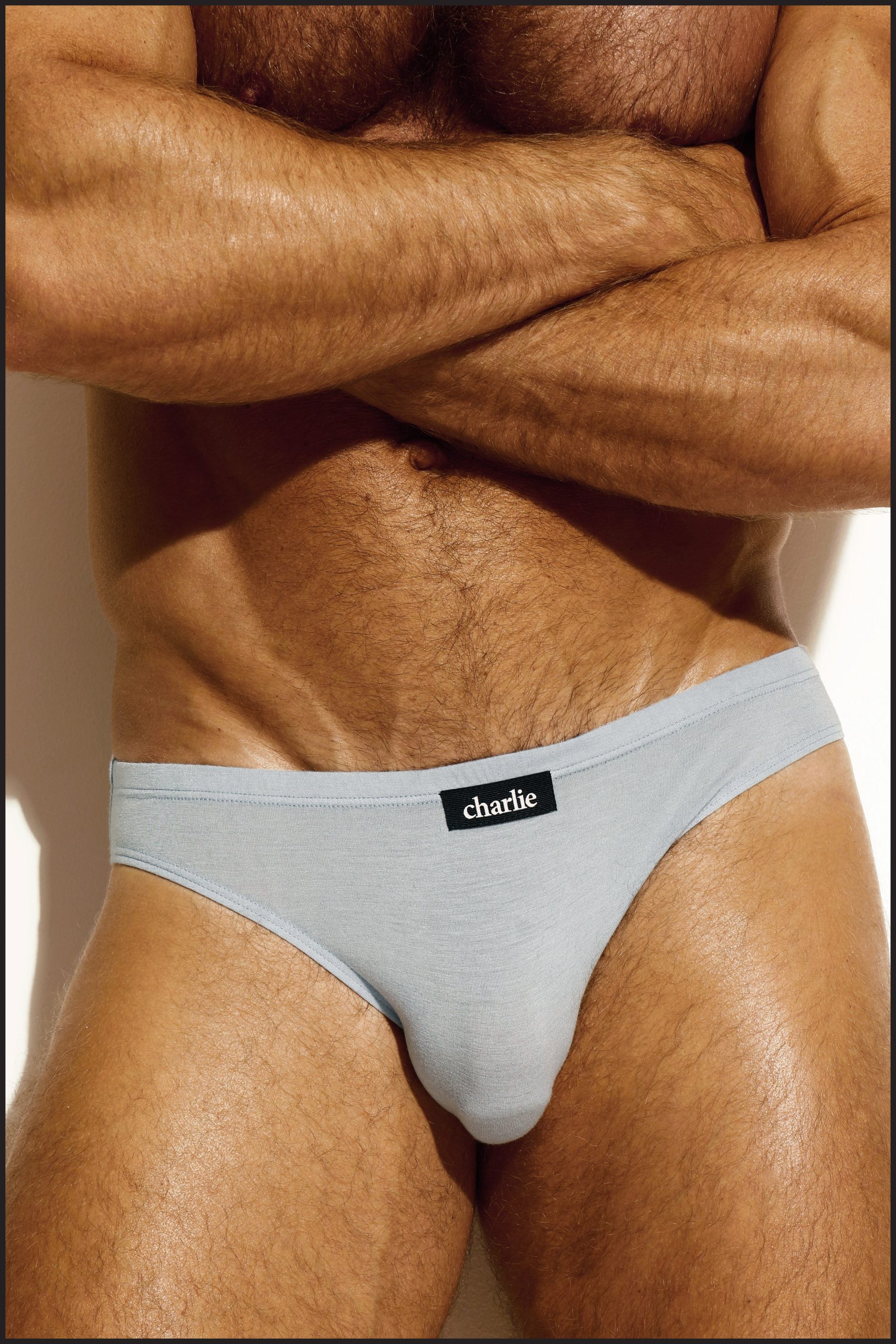Barely Blue Italian Cashmere Blend Charlie Bikini Brief with 5/8 fabric-covered waist elastic and black Charlie label. Single layer front pouch.