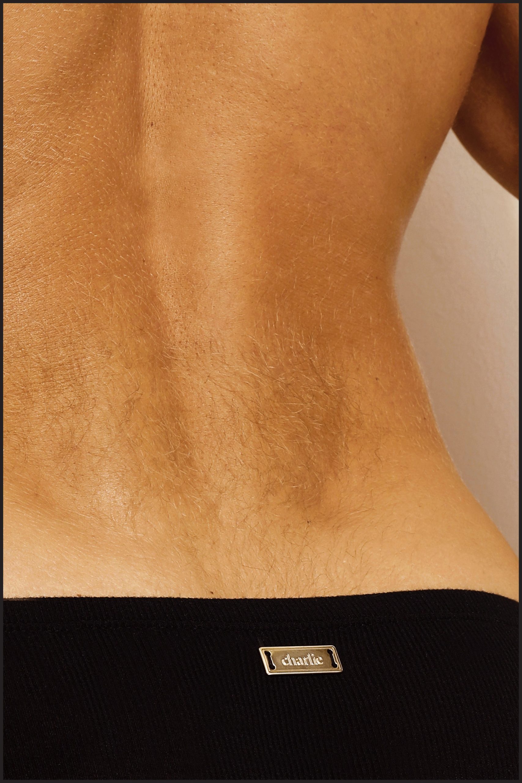 Ribbed?Black Charlie Bikini?Brief with 5/8 fabric-covered?waist elastic?and gold Charlie label.??Single layer front pouch.?