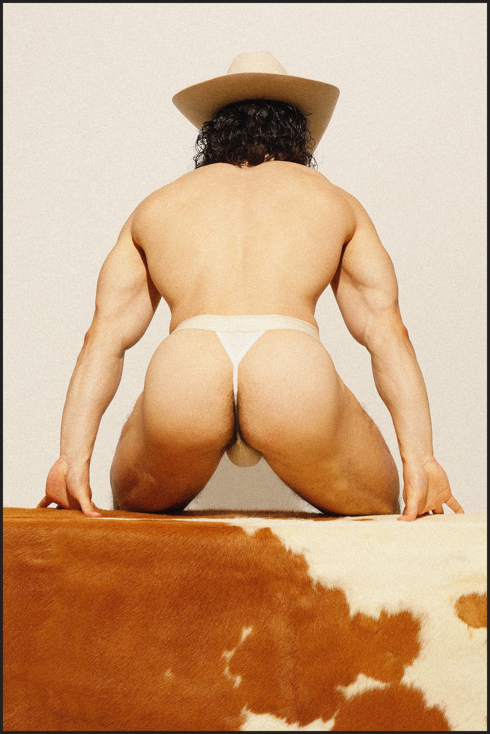 Ribbed Buck Charlie Classic Thong with Cream logo waistband and Gold label. Single layer front pouch.