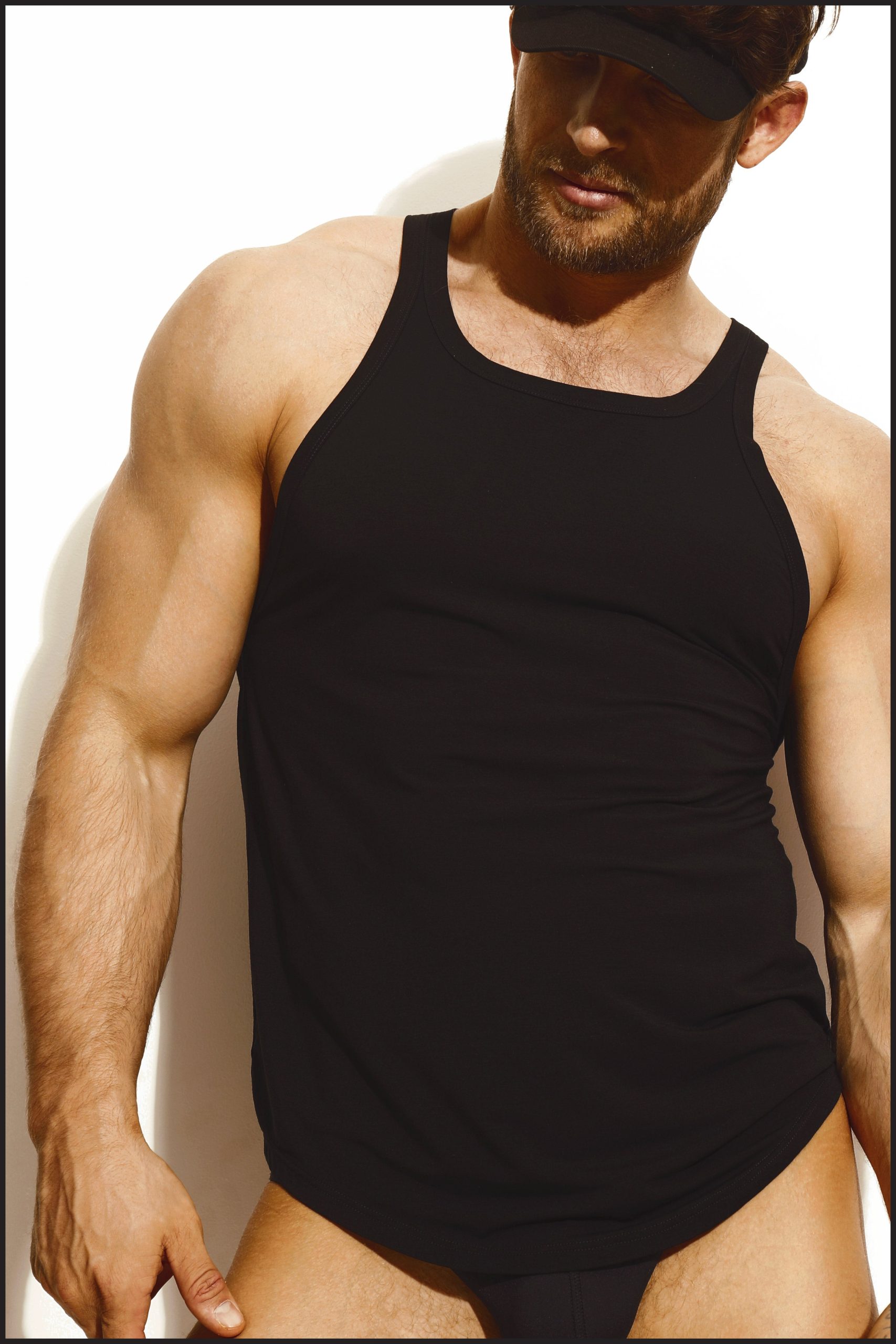 Charlie by Matthew Zink black micromodal Fitness Tank. Tank has shaped shirt tail hem.?
