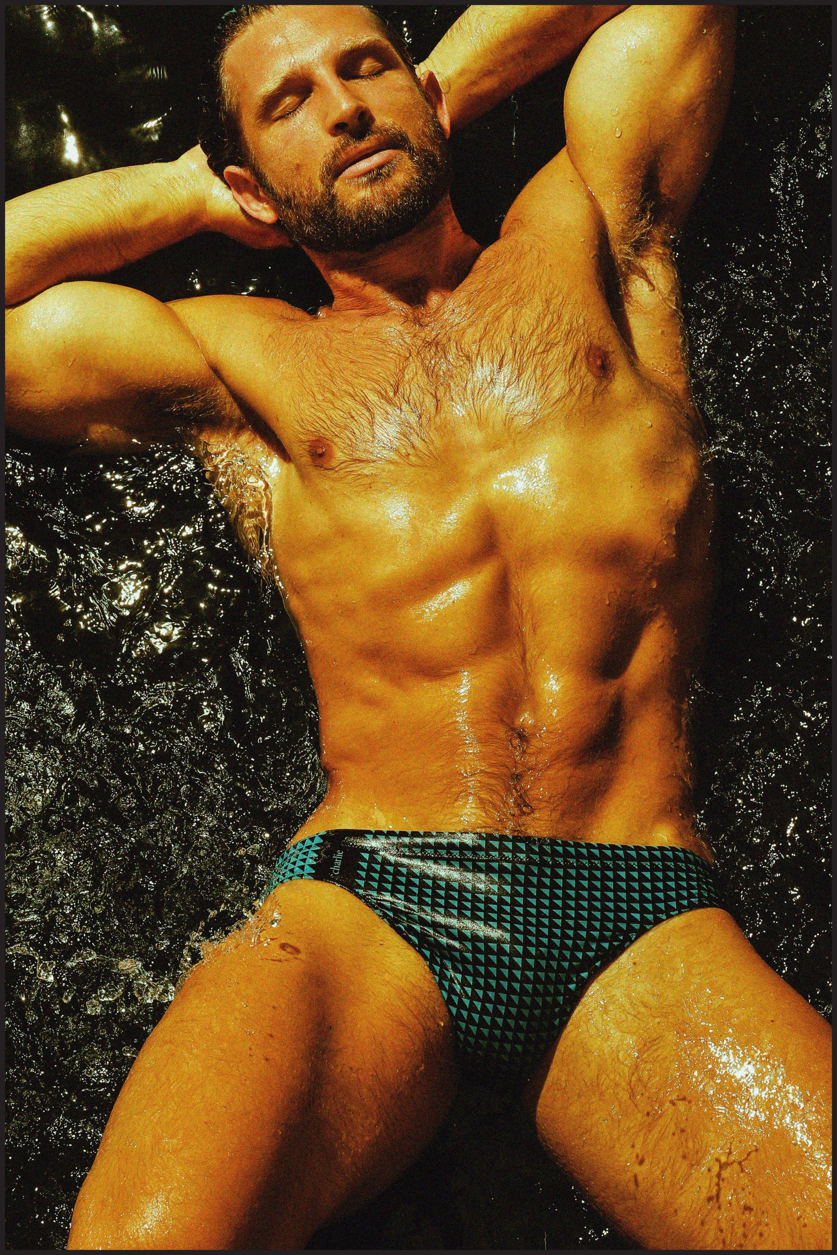 Printed in Italy. Charlie by Matthew Zink Cerulean Icon Scarf Lowrise Brief. Similar cut to our best selling lifeguard brief but with a seamless center front and inside elastic drawstring waist. Our signature liquid fabric is sensually silky and lightweight for an almost naked feeling with a subtle luster. Front lined.