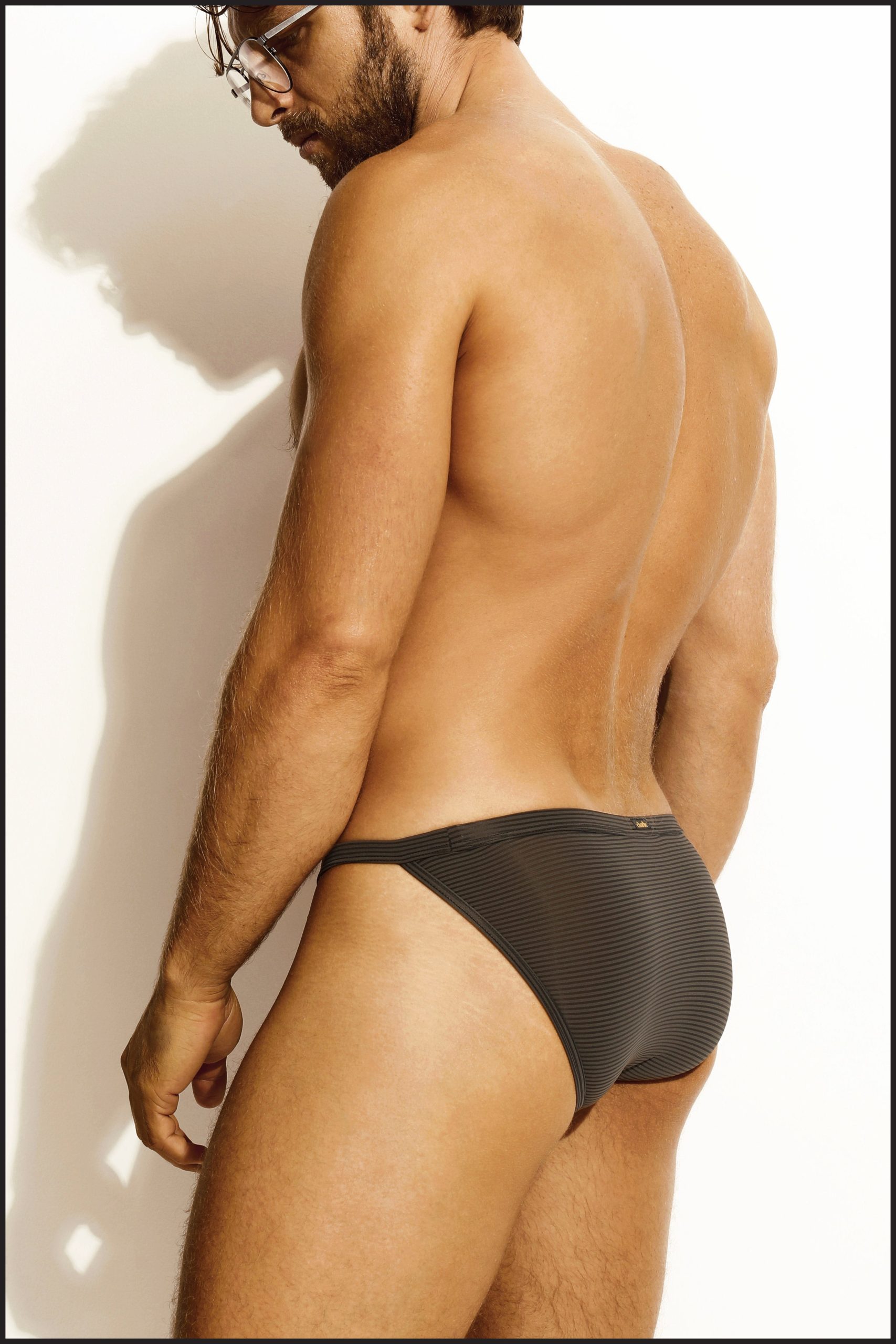 Grey Sheer Stripe Charlie Muscle Brief with 1/2 fabric-covered waist elastic. Single layer front pouch.