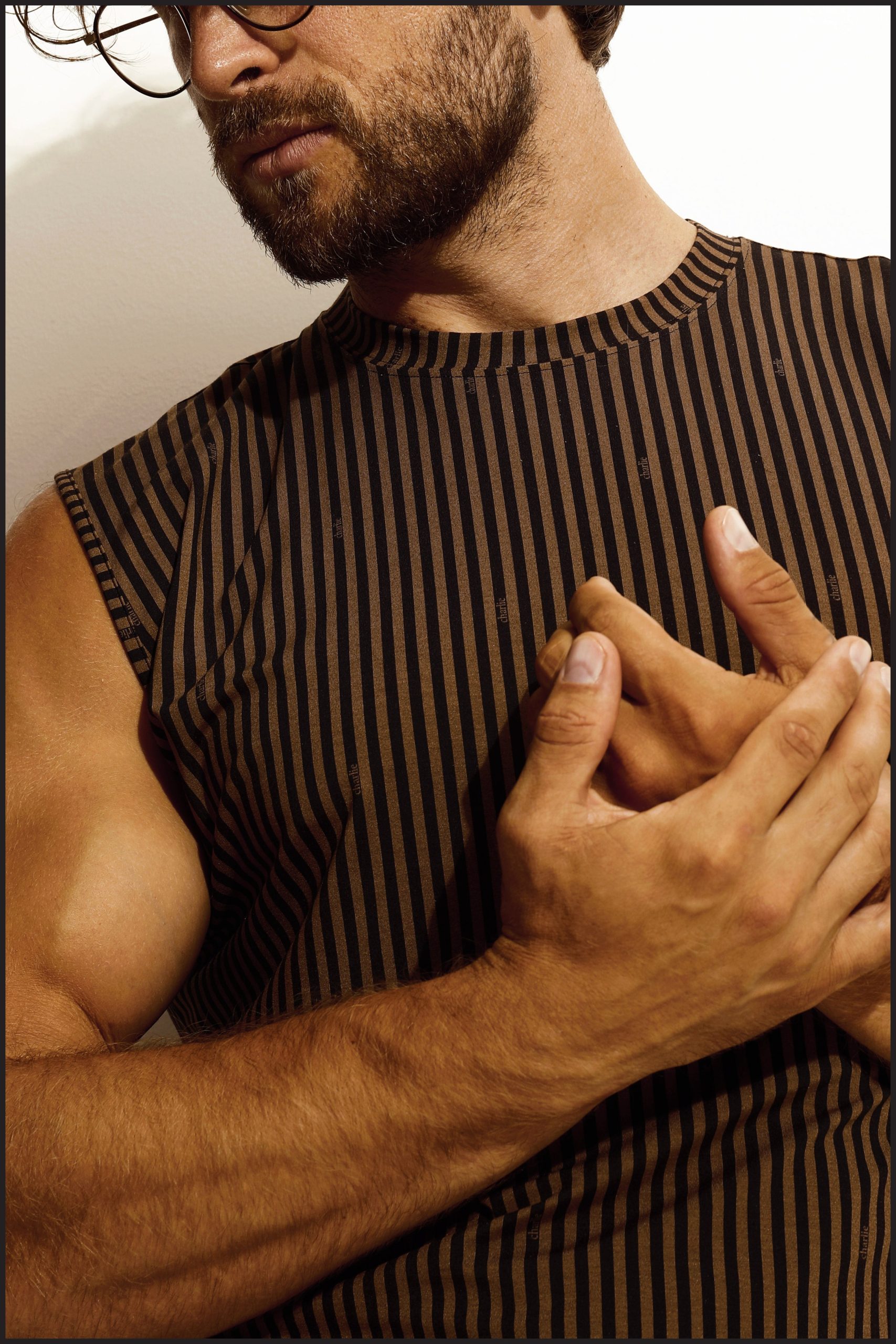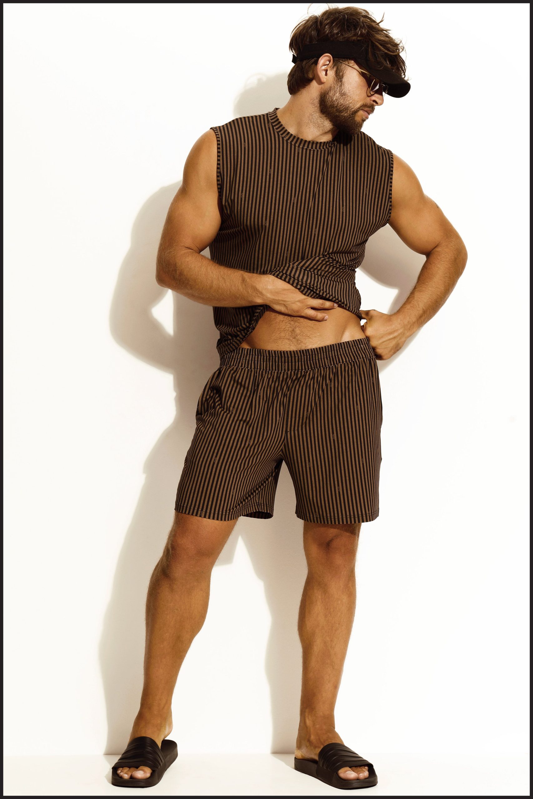 Charlie by Matthew Icon Stripe printed Sleeveless Tee Shirt with a shaped. shirt tail hem and black Charlie label.
