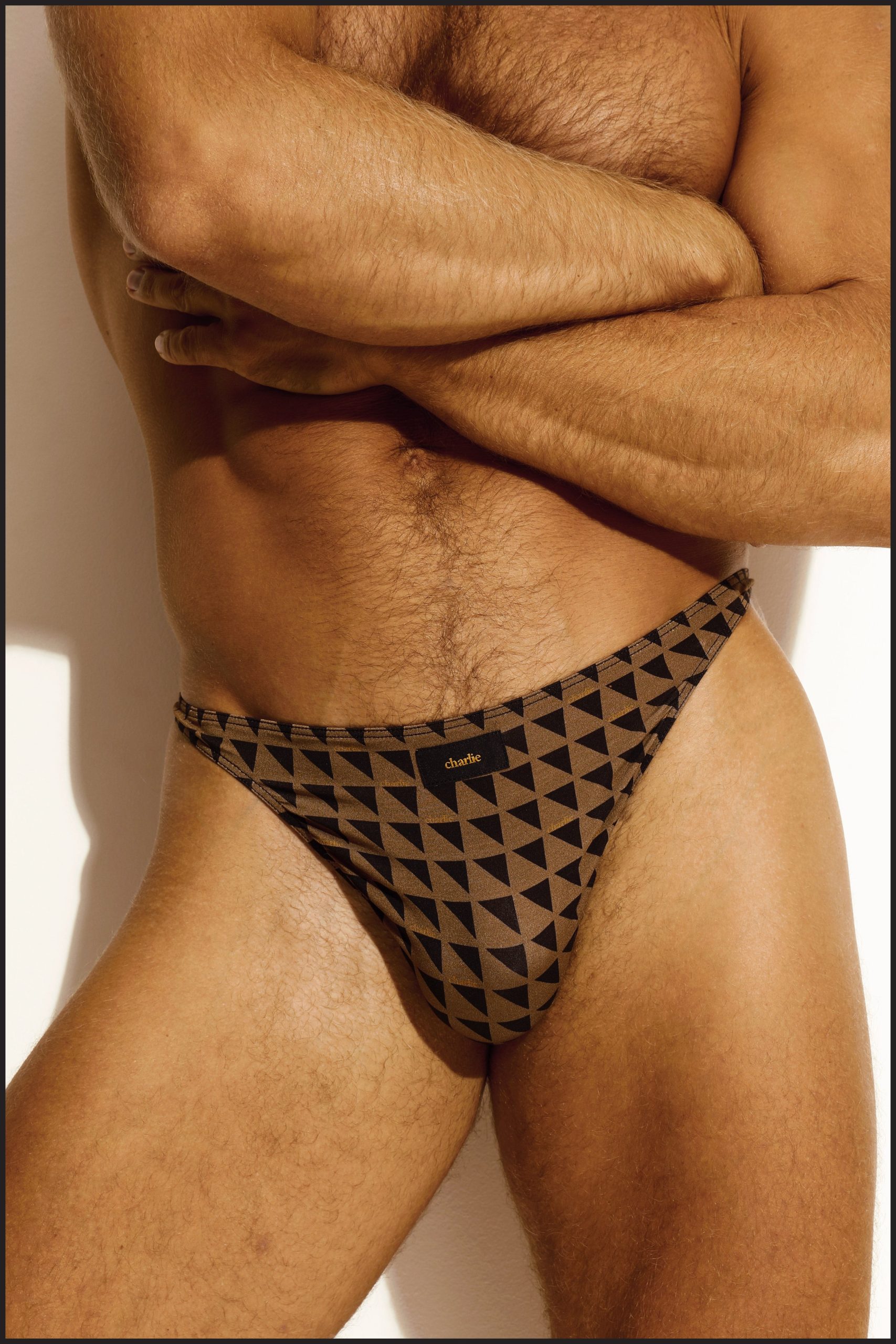 Charlie by Matthew Zink Cafe Icon Geo printed High-Cut Boomerang Thong. High-cut leg with a shaped thong back panel and black Charlie label. Single-layer front pouch.?