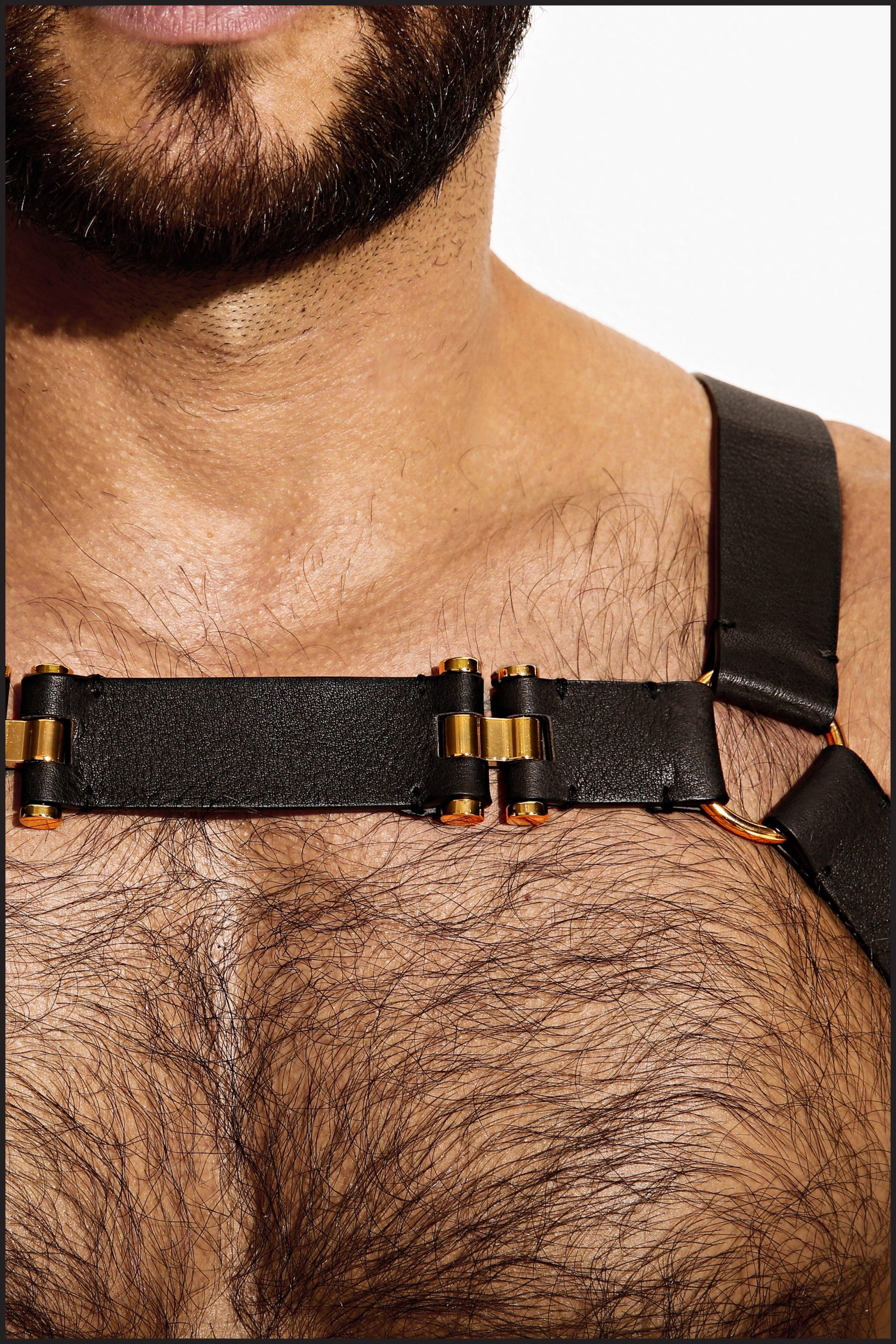 Adjustable Genuine Leather Chest Harness with gold hardware and 1 1/8 straps. Hand-inked edges.