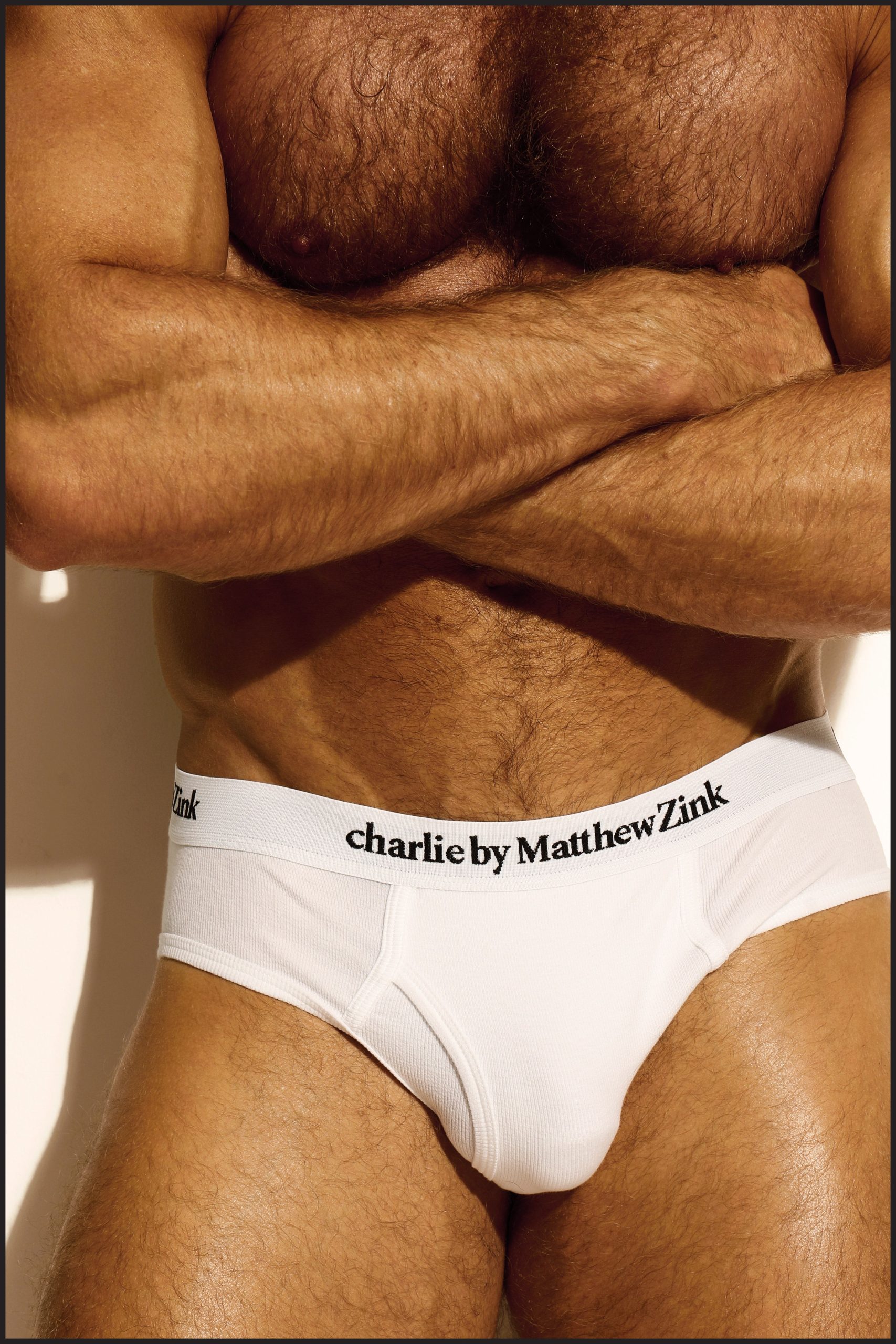 Charlie by Matthew Zink White Original Brief with fly front.? Made from our classic ribbed stretch cotton with white?logo?waistband elastic. Double layer front pouch.