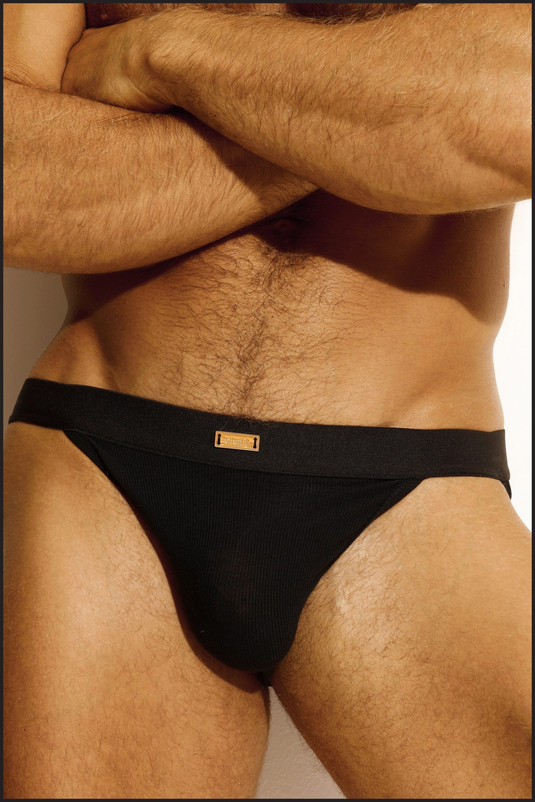 Charlie by Matthew Zink Black Ribbed Sport Brief with 1 1/2 black waistband elastic and gold Charlie label. Single layer front pouch.